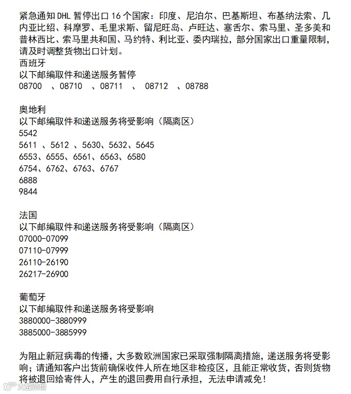不少快递、货代公司都发出了DHL、UPS、FEDEX的暂停信息!