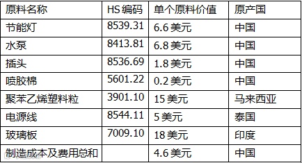案例5:中国企业生产的水族箱(HS7013.99)(FOB价58美元/个)出口到新加坡, 水族箱的原产地标准之一是区域价值成分40%。所使用的原料如下: