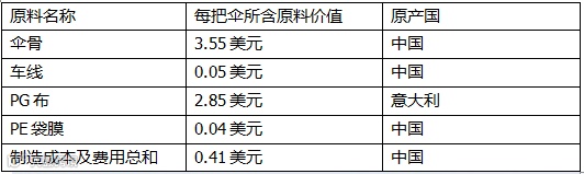 通过两种计算公式得出结果区域价值成分为58.7%,大于40%,所以可以判定遮阳伞为中国原产。