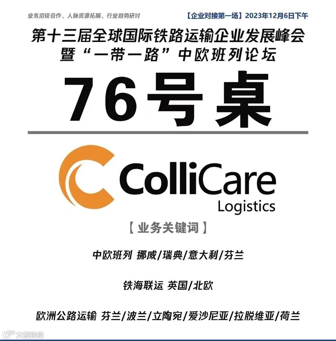 第十三届全球国际铁路运输企业发展峰会暨“一带一路”中欧班列论坛将于12月6-7日在成都举办,ColliCare中国将出席会议并在12月6日下午和7日上午设有一对一业务洽谈桌,欢迎各位新老朋友、业务精英莅临指导!
