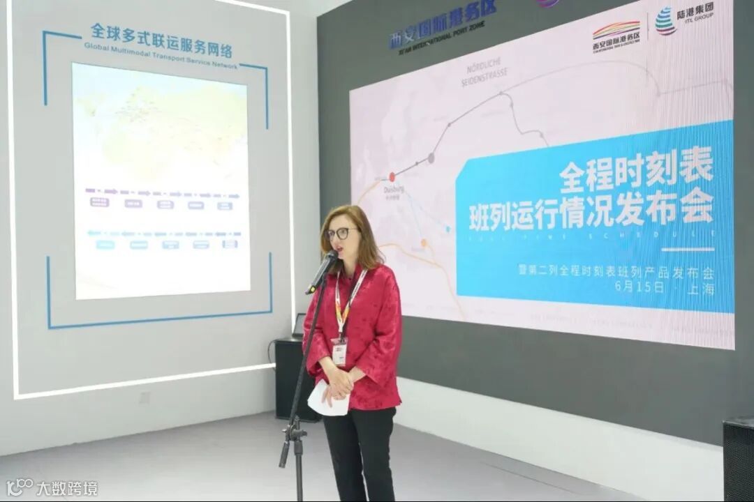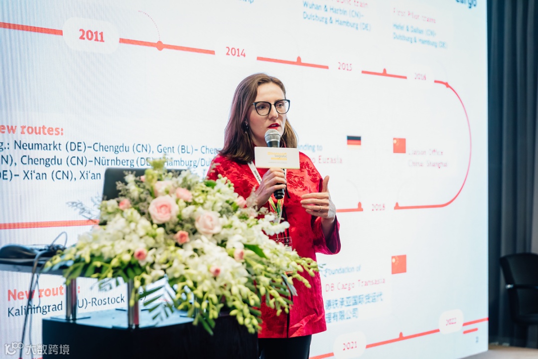 康贝雅女士参加了此次会议并进行了发言:“德铁货运联合中国铁路集团和西安国际陆港集团自2022年10月开始运行全程时刻表班列,将铁路运输时效缩短到了12天。这无疑是非常成功的项目,同时也为欧亚走廊未来的货运发展树立了里程碑。货物运输选铁路,让我们一起共创美好未来!”