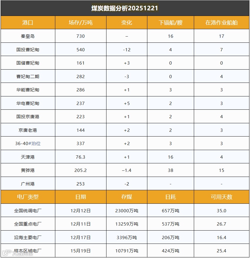 截至12月21日,环渤海港口煤炭库存为3221.5万吨,环比前一日减少1.4万吨。