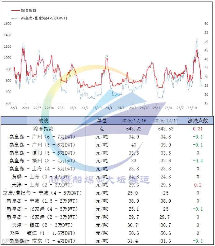 中国沿海煤炭运价综合指数小幅上涨0.31点,报643.53点,各航线运价涨跌幅度在-0.4元/吨至0.2元/吨之间。沿海运输市场延续平淡走势,新增货盘有限,市场商谈清淡,运价缺乏上涨动力,继续保持平稳运行。