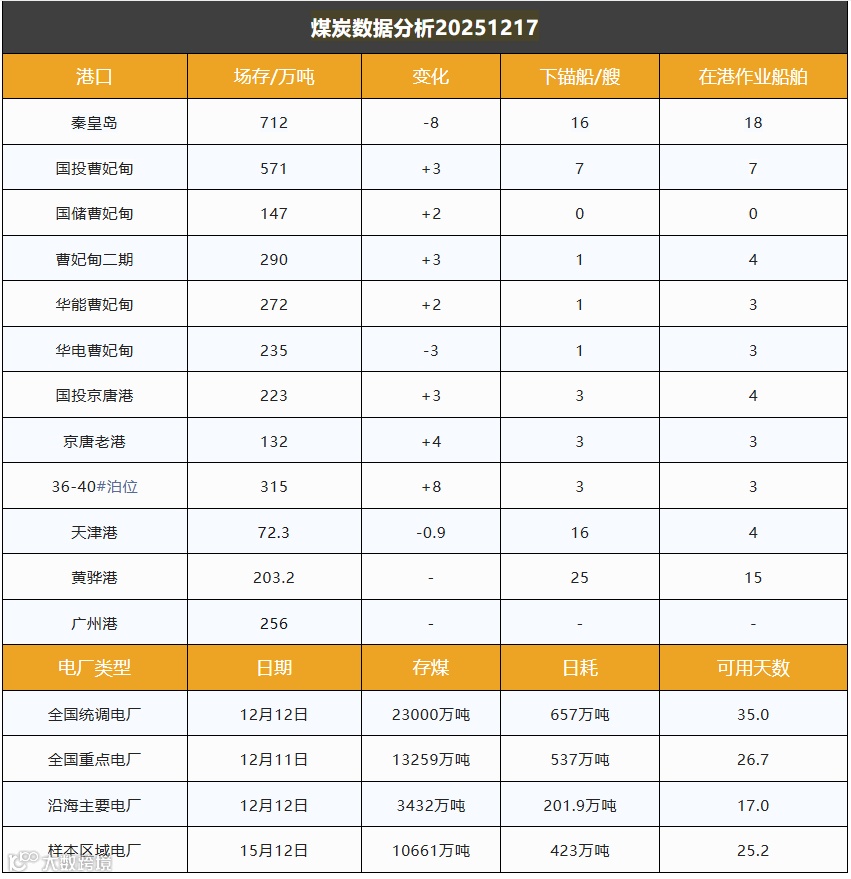 截至12月17日,环渤海港口库存达3172.5万吨,较前一日增加13.1万吨。随着港口场地渐趋饱和,疏港压力进一步加大,港口集港发运规模相应收缩,铁路调入量已降至中位。市场观望情绪较浓,终端采购节奏放缓,港口调出量整体低于调入,库存持续累积,但累库速度有所减缓。