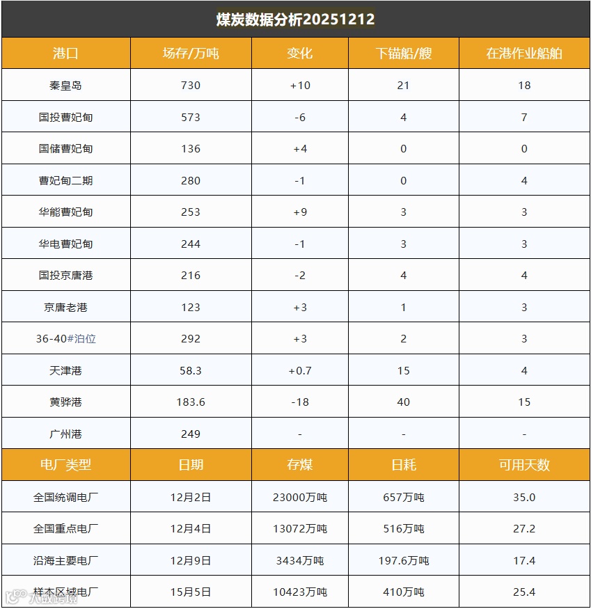 截至12月12日,环渤海港口煤炭库存3088.6万吨,环比前一日增加1.7万吨。港口场地紧张与销售不畅降低贸易商发运意愿,大秦铁路及呼铁局批车量下降,港口调入量处于中位水平。当前沿海电厂存煤整体合理,煤价继续下行且降幅扩大,终端观望情绪浓厚,北上拉运节奏放缓。叠加港口间歇性封航影响装卸作业,港口调出量也有所回落,目前略低于调入量。