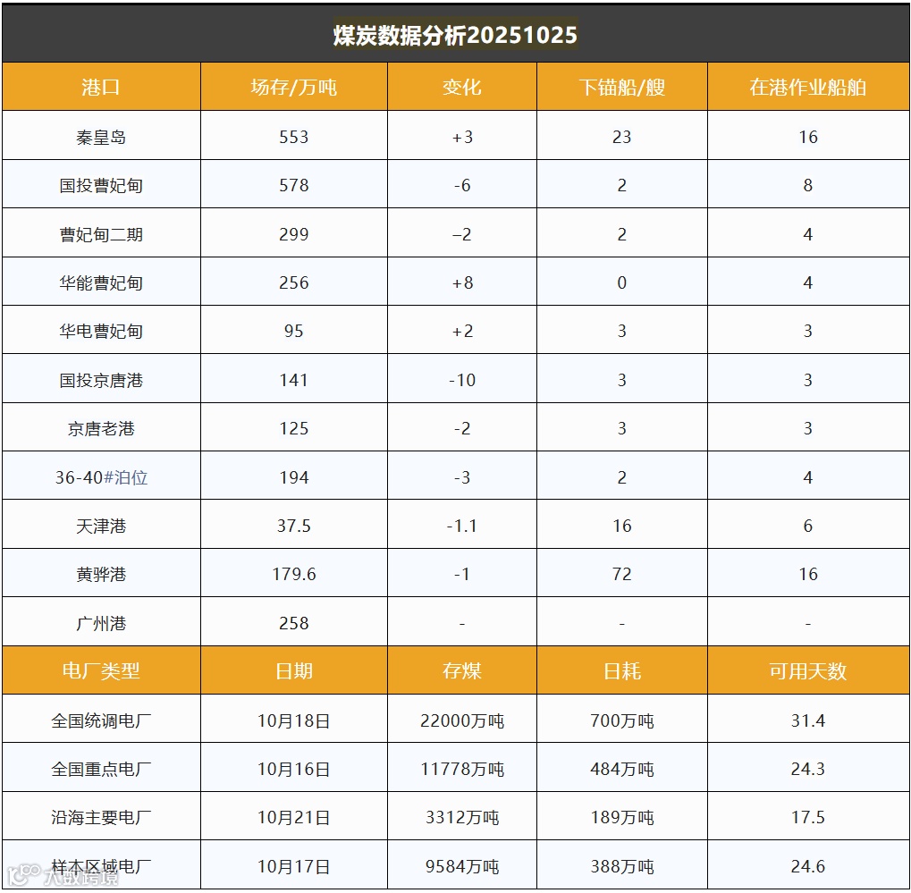 港口动力煤市场报价整体持稳。目前下游以刚需采购为主,普遍存在压价心态,对高价煤接受度不高。随着南方高温天气结束,居民用电负荷下降,沿海电厂日耗逐步回落。