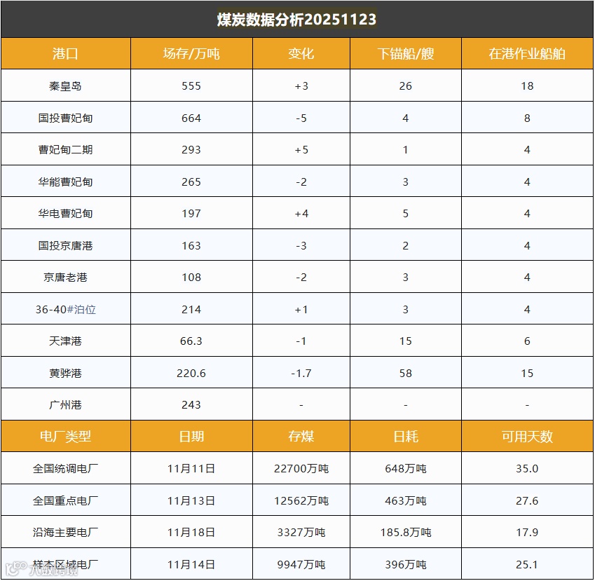 截至11月23日,环渤海港口库存为2745.9万吨,较前一日下降1.7万吨,为连续多日垒库后首次出现回落。