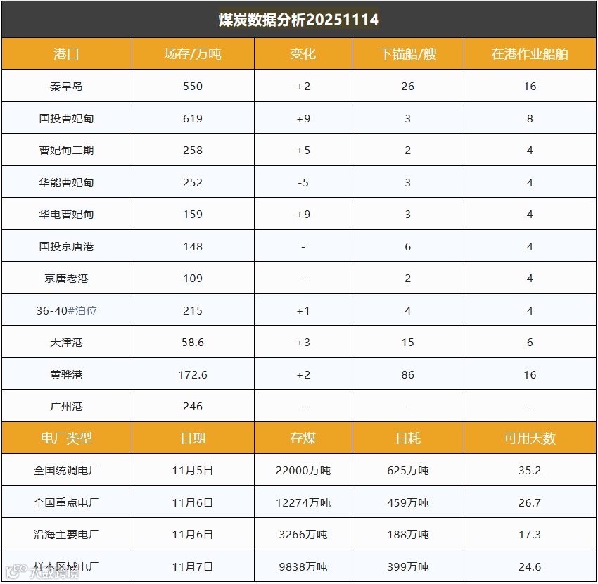 截至11月14日,环渤海港口煤炭库存达2541.2万吨,较前一日增加26万吨。