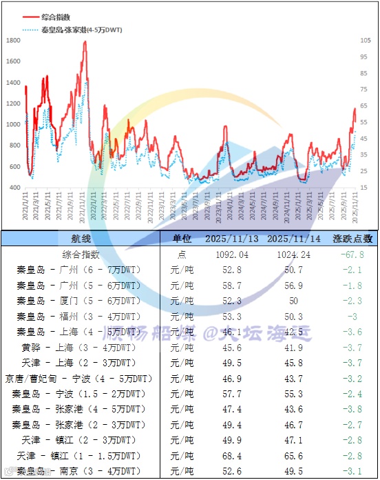 中国沿海煤炭综合运价指数下跌67.8点至1024.24点,各航线运价较昨日下跌1.8~3.7元/吨不等。今日市场商谈氛围略有回温,但终端用户采购节奏放缓,保持观望,新增货盘明显减少,海运市场呈现船多货少格局。不过,后续市场仍存积极因素:随着冬季用煤高峰到来,日耗逐步攀升,将带来一定刚需及补库需求;此外,16日起一股强寒潮将迅速影响中东部地区,可能加快煤炭消耗,并带来大风封航风险。