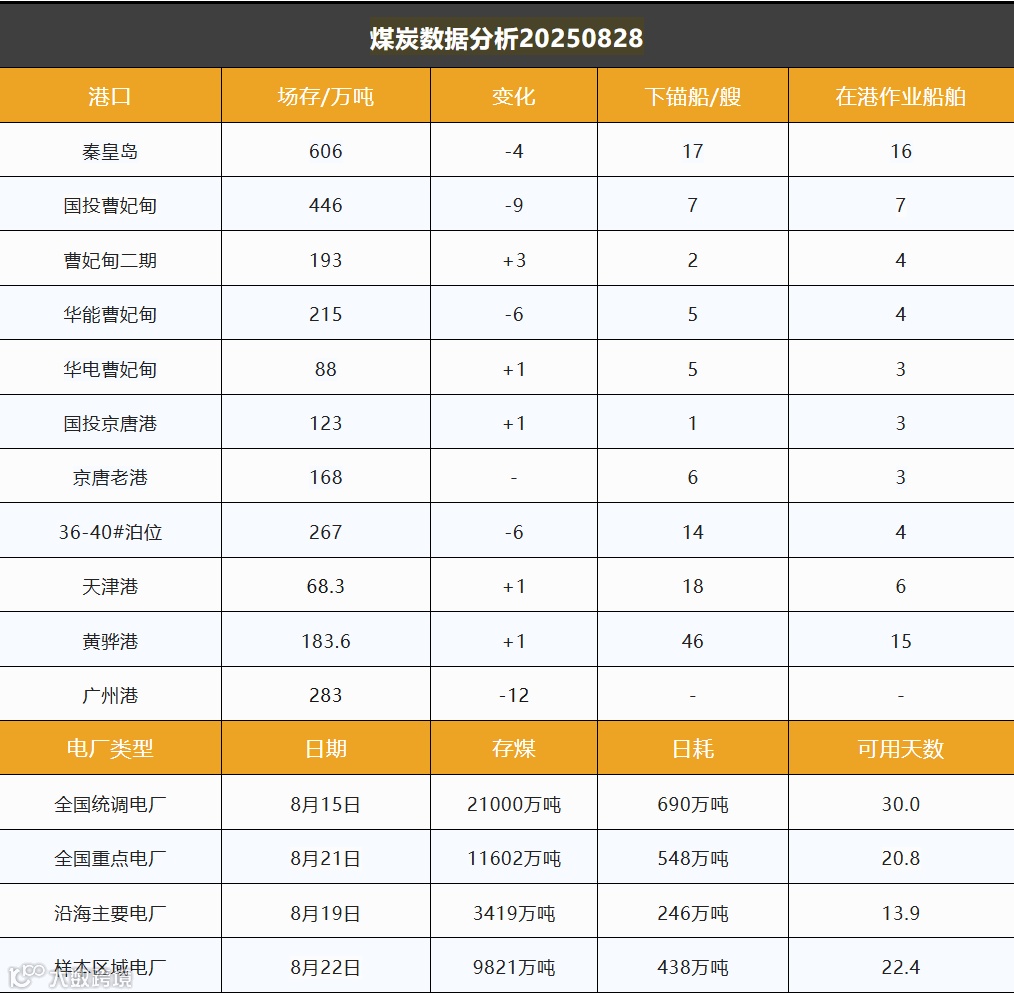 截止8月28日,环渤海港口库存为2357.9万吨,呈小幅回落态势(日环比减少18万吨)。港口市场弱势运行,贸易商低价抛货,下游采购观望情绪浓厚,成交困难。