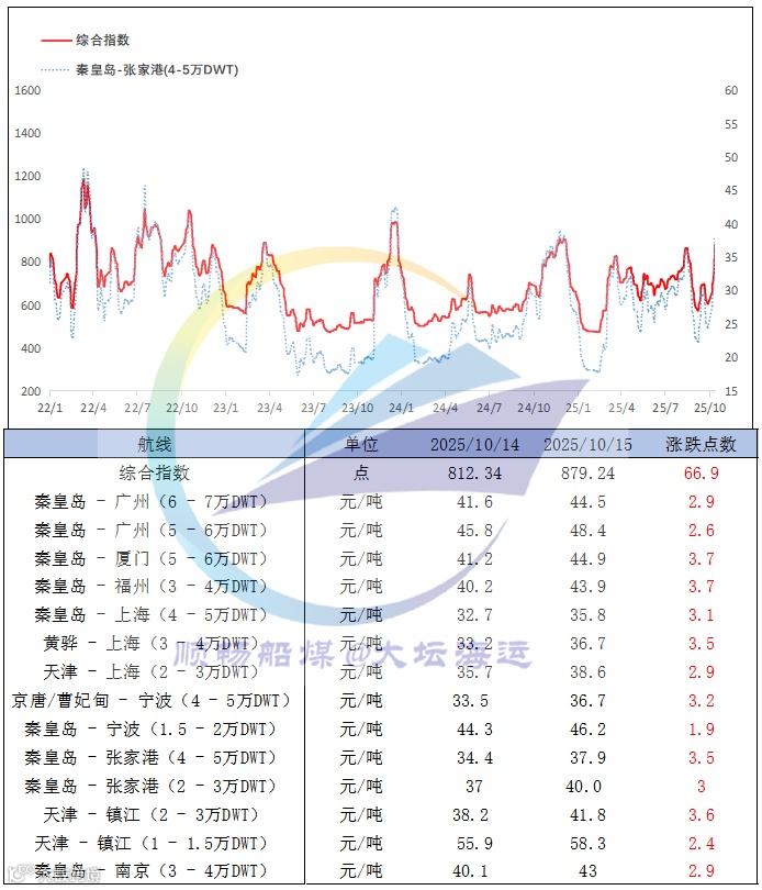 此外,中国沿海煤炭运价综合指数上涨66.9点至879.24点,各航线运价涨幅在1.9元/吨至3.7元/吨之间。