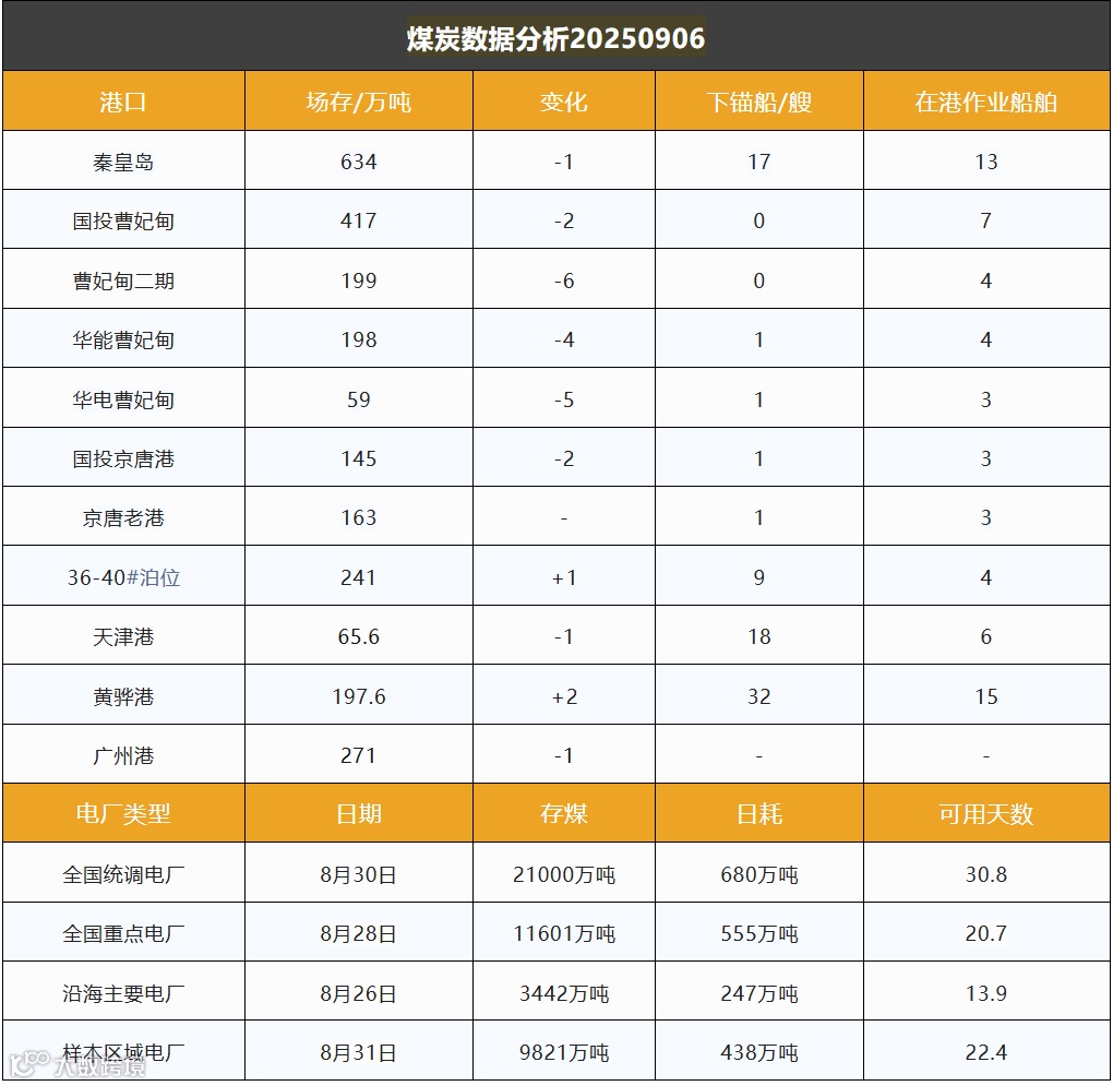 截至9月6日,环渤海港口煤炭库存为2319.2万吨,较前一日减少18万吨。