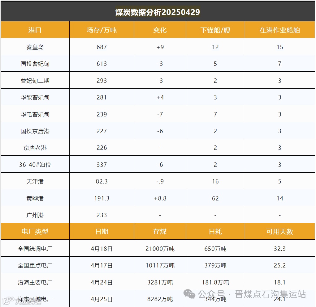 截至4月29日,环渤海港口库存3176.6万吨,环比下降4万吨,但整体维持平稳。大秦线检修结束后铁路运力恢复,港口调入量增加;而下游调出量因需求疲软小幅下降,供需趋于平衡。