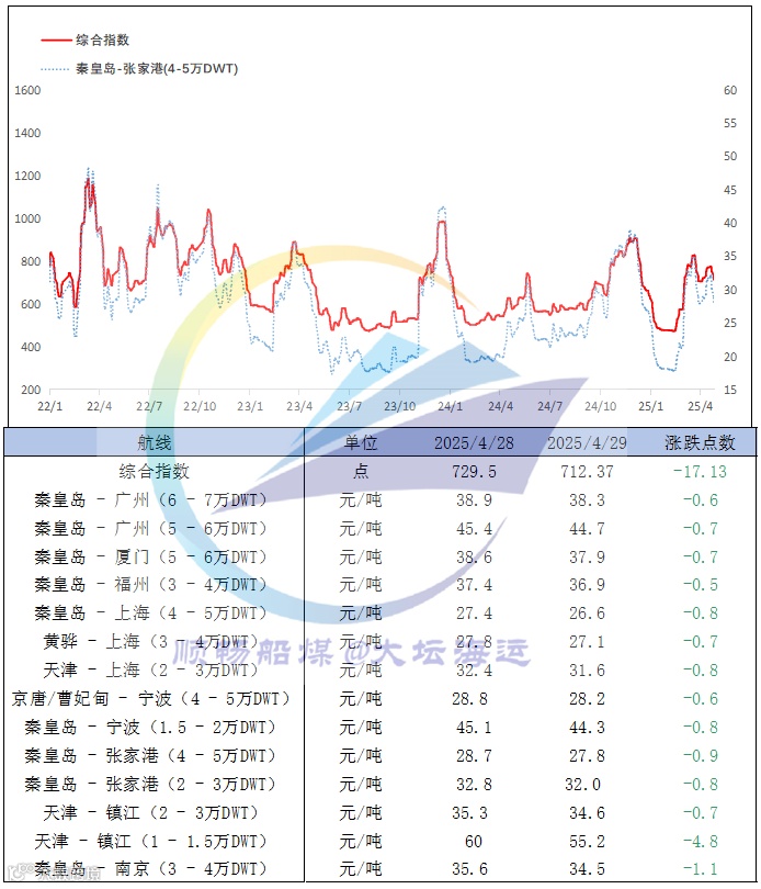 中国沿海煤炭运价单日跌幅达2.4%(综合指数712.37点),各航线运价普降,反映短期拉运需求减弱,进一步验证市场活跃度下降。