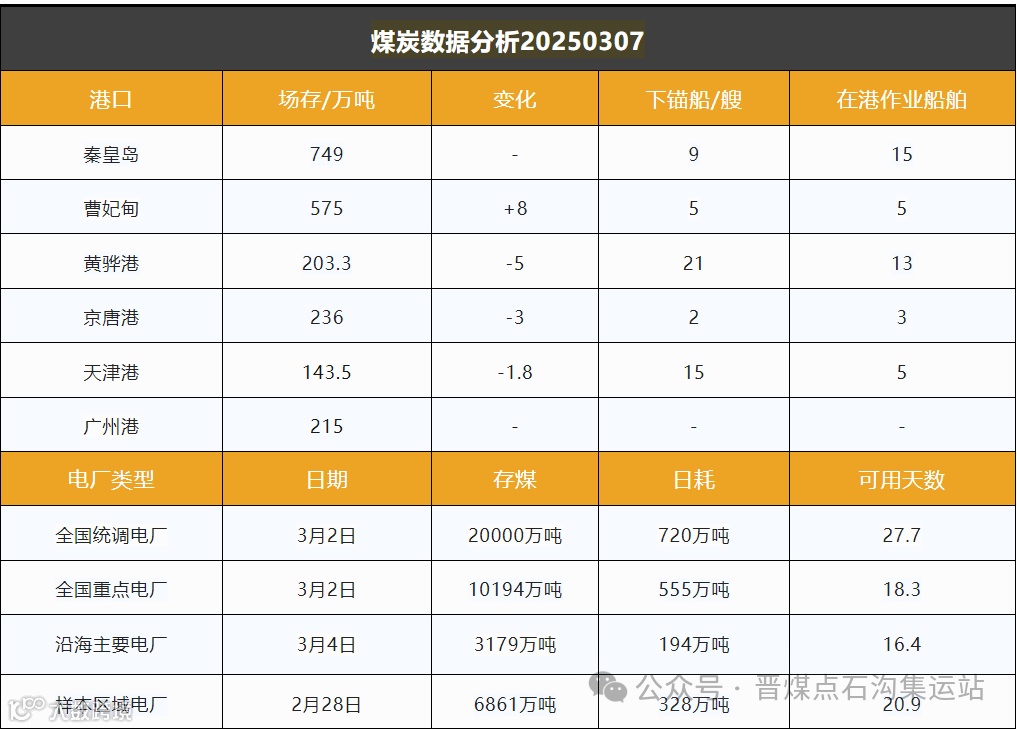 截至2025年3月7日,环渤海5港的煤炭库存为1906.8万吨,较前一日减少了1.8万吨。同时,不同热值的煤炭价格均有所上涨,5500卡、5000卡和4500卡的价格每吨分别上涨了2元。