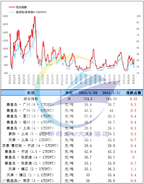 中国沿海运价综合指数上涨9.53点至744.33点,但各航线涨幅收窄(0-1.1元/吨),补库带动船运需求。