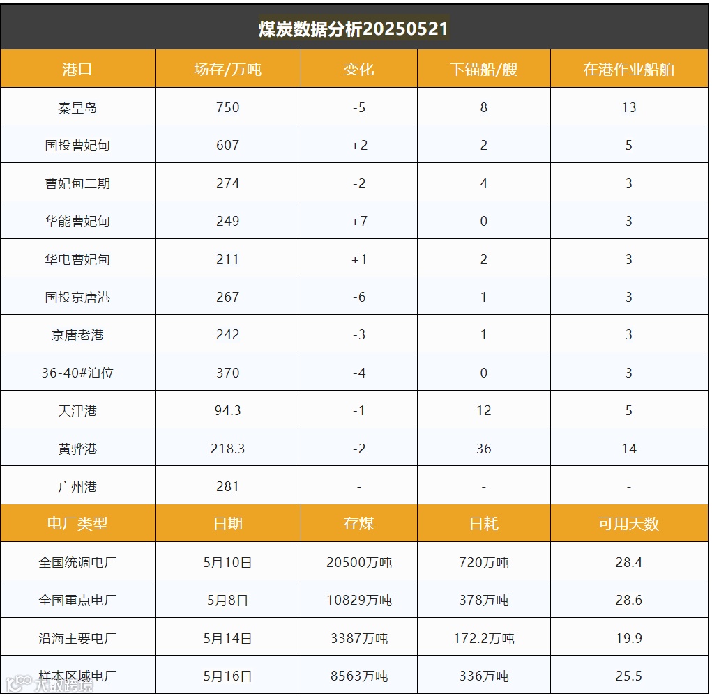 截至5月21日环渤海港口总库存3282.6万吨,单日下降14万吨。若持续去库,可能缓解当前供应宽松局面,对煤价形成支撑。近日覆盖大部分地区的高温天气可能带动日耗攀升,叠加下游补库需求,库存消化或加速,可能推动煤价企稳后反弹。