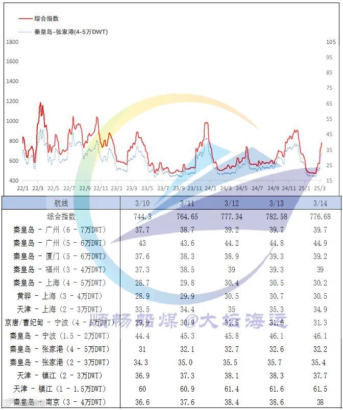本周,中国沿海煤炭运价呈现先涨后跌的走势,综合指数报收776.68点,环比上涨7.24%。各航线运价涨幅在2元/吨至3元/吨之间。