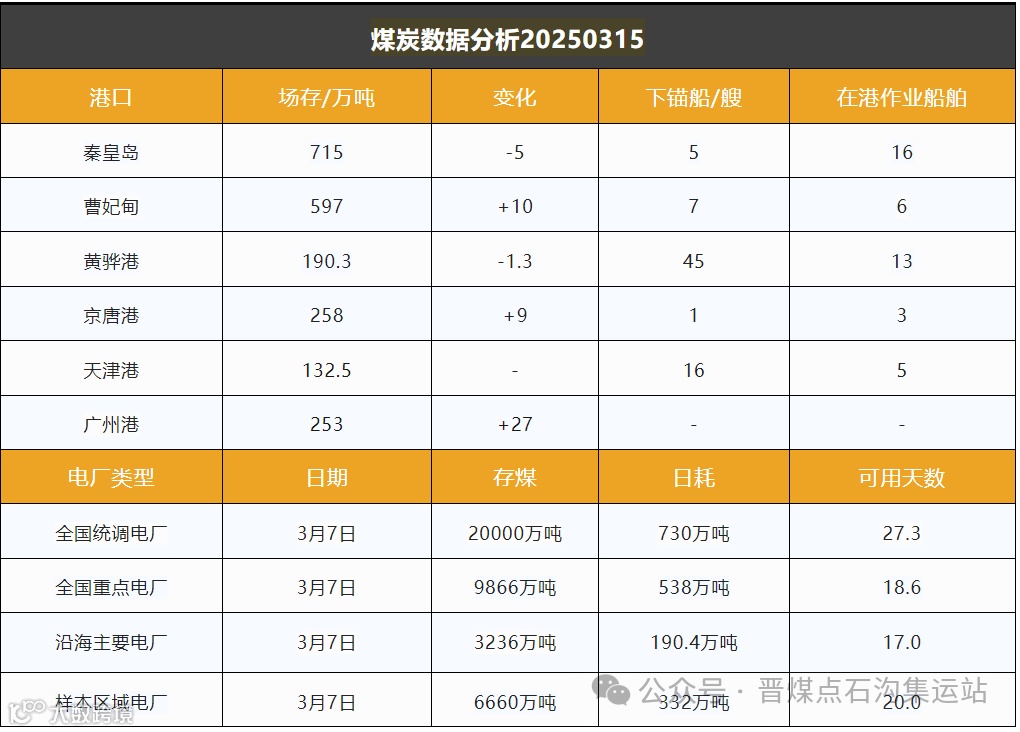 截至2025年3月15日,环渤海五港的煤炭库存达到1892.8万吨,较前一日增加了12.7万吨。当前电煤日耗预期有所回落,尽管非电需求有所改善,但仍不足以弥补电煤日耗下降的缺口,这可能导致煤价面临较大的下行压力。