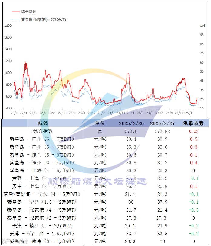 2月27日,中国沿海煤炭运价综合指数微涨0.02点至573.82点,各航线运价涨跌互现,幅度在-0.3元/吨至0.5元/吨之间。随着3月传统用煤淡季的临近,煤价下行压力加剧,市场情绪普遍悲观。受月末效应影响,终端拉运积极性明显减弱。尽管近期BDI指数持续上涨,外贸行情有所回暖,对沿海市场形成一定支撑,但华东航线因运力充裕出现小幅下调。