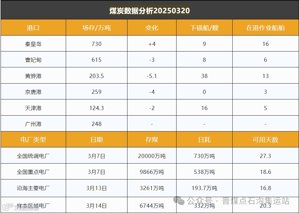 截至2025年3月20日,环渤海5港的煤炭库存为1931.8万吨,较前一日减少了10.1万吨。不同热值的煤炭价格也有所变动,其中5500卡和5000卡的价格均下降了2元,而4500卡的价格保持不变。