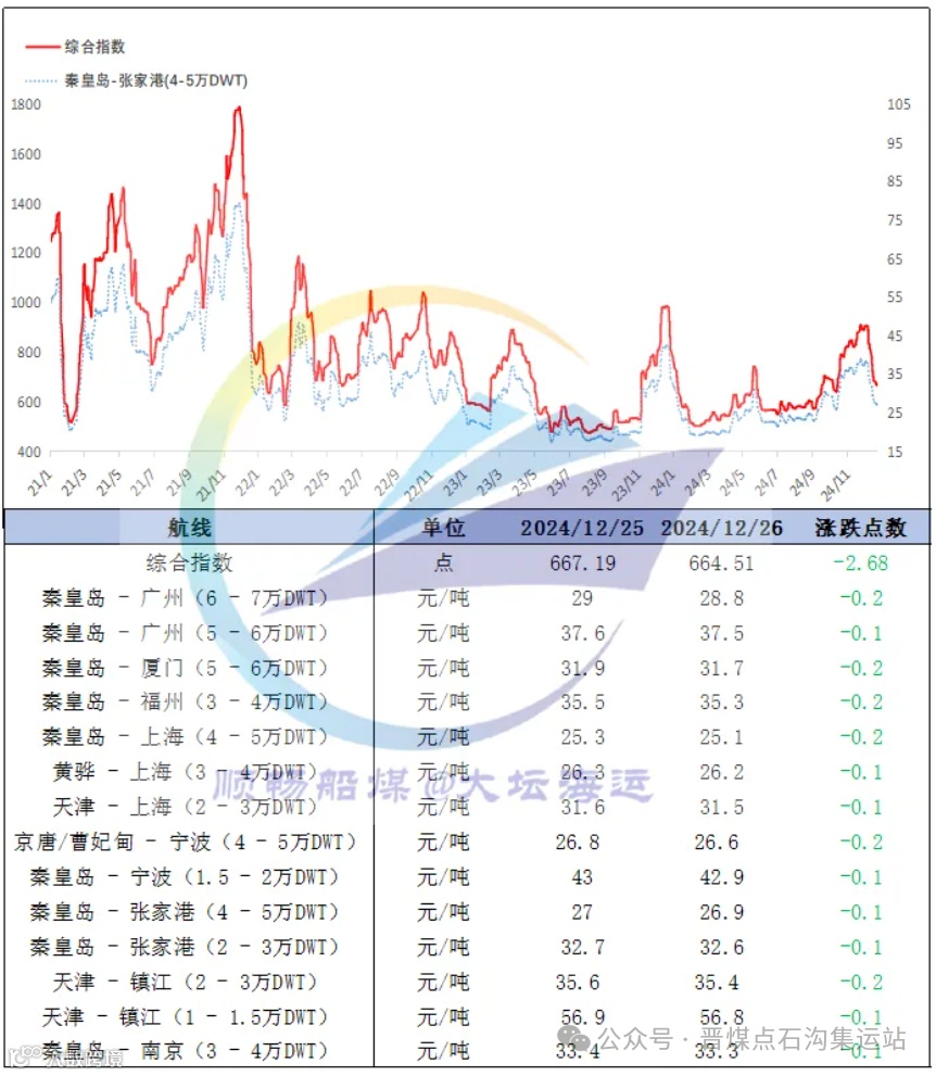 26日,中国沿海煤炭运价综合指数下跌2.68点至664.51点,各航线运价跌幅在0.1元~0.2元/吨不等。进口贸易商拿货成本相应下降,叠加终端维持低价刚需采购,多数投标价明显下调,低卡煤种较内贸煤仍有一定价格优势。预计短期内进口煤价将延续弱势运行,后续需关注外矿报价及终端采购节奏。