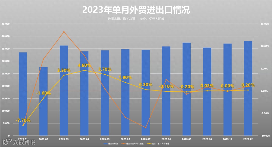 单就2023年12月而言,进出口总值环比增加2.8%,出口总值环比增加3.5%,进口总值环比增加2%。