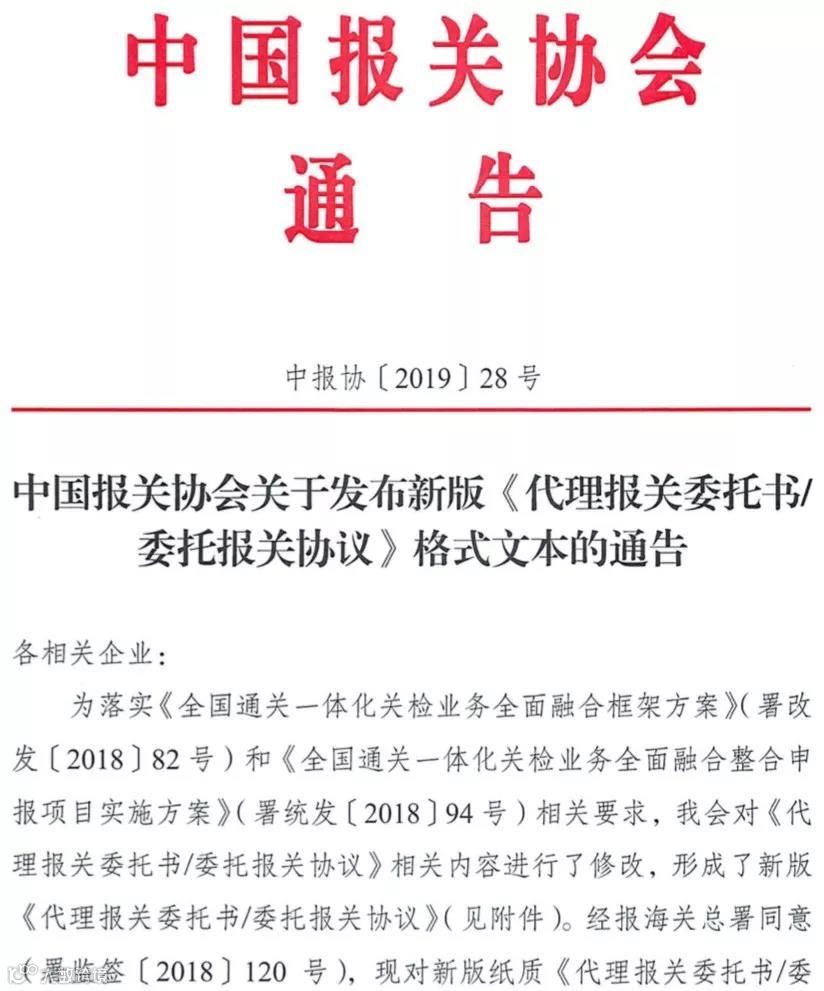 今天,中国报关协会发布通告,通告称经海关总署同意,发布新版《代理报关委托书/委托报关协议》(点击“阅读原文“可下载PDF版),新版报关委托书即日起可使用。旧版《代理报关委托书/委托报关协议》将于今年6月1日起废止。