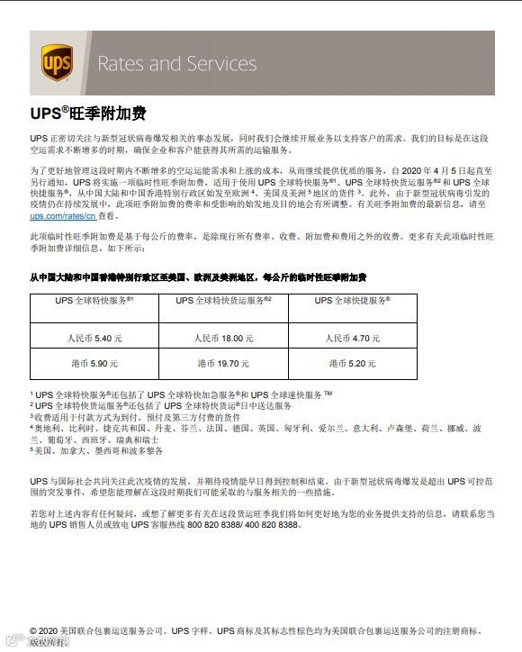 为了更好地管理这段时期内不断增多的空运运能需求和上涨的成本,从而继续提供优质的服务,自 2020 年 4 月 5 日起直至另行通知,UPS 将实施一项临时性旺季附加费,适用于使用 UPS 全球特快服务、UPS 全球特快货运服务和 UPS 全球快捷服务,从中国大陆和中国香港特别行政区始发至欧洲、美国及美洲地区的货件。