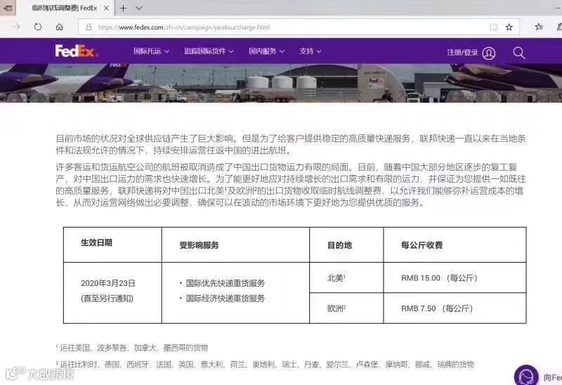 FedEx为了能更好地应对持续增长的出口需求和有限的运力,并保证为您提供一如既往的高质量服务,FedEx快递将对中国出口北美1及欧洲2的出口货物收取临时航线调整费,以弥补运营成本的增长,从而对运营网络做出必要调整,确保可以在波动的市场环境下更好地为您提供优质的服务。