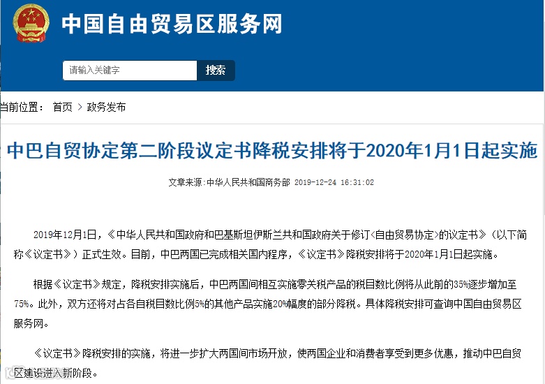 目前,中巴两国已完成相关国内程序,《议定书》降税安排将于2020年1月1日起实施。