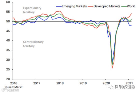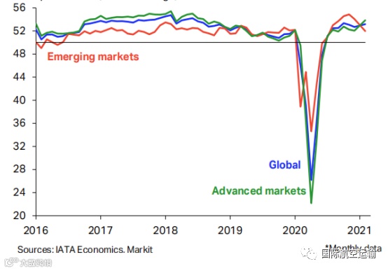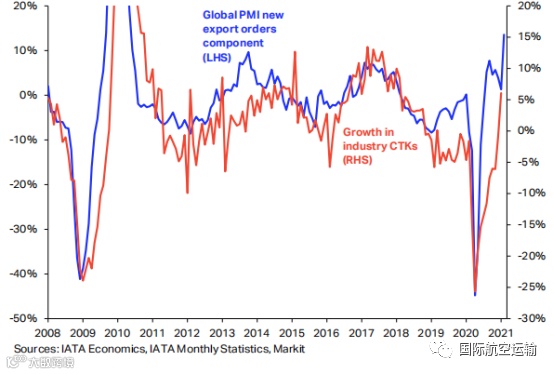 在2020年末市场趋于稳定后,2月份新出口订单增长飙升至自2010年全球金融危机复苏以来的最高值。这表明航空货运需求强劲,但运力不足阻碍了更具活力的反弹。