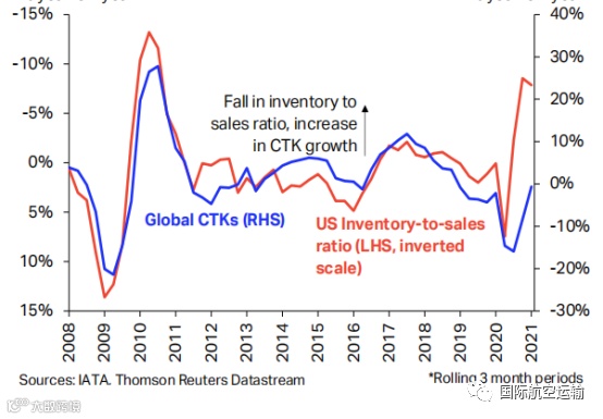 2020年下半年,商品库存与销售额之比大幅下降,随后稳定到与低库存一致的水平。虽然这通常会支持CTKs,但运力不足和供应链中断意味着复苏被推迟。