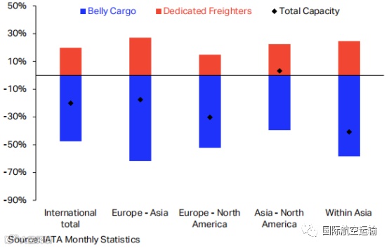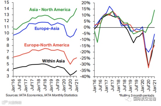在截至2021年1月的三个月内,尽管全球再次爆发了新冠疫情,并实行了旅行限制措施,但国际航线腹舱总容量有所提升。同时,全货运航司通过新交付和更高的飞机每日利用率提高了运力。