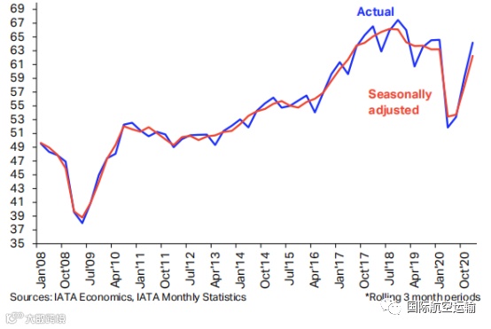 在截至2021年1月的三个月内,受强劲的制造业活动和电子商务需求的推动,航空货运量呈V形复苏。在此期间,经季节性调整(SA)的货物吨公里(CTKs)接近2019年的数值。