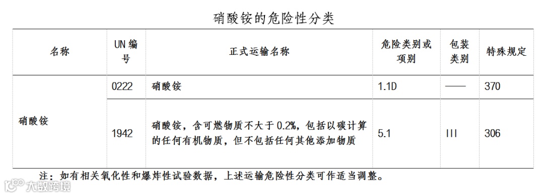 硝酸铵在TDG、IMDG Code、IATA-DGR、ADR以及JT/T 617.3等法规中均属于列明的危险货物。