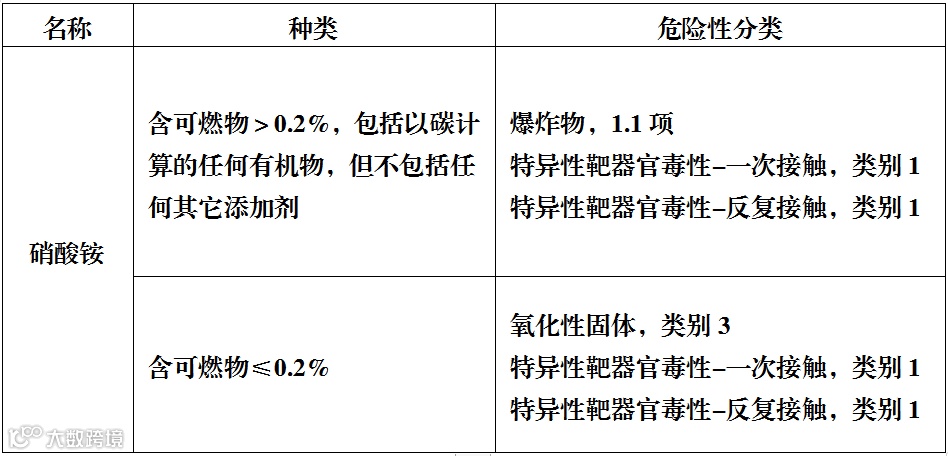 按照《危险化学品目录》(2015年),硝酸铵分为两种,其危险性分类有: