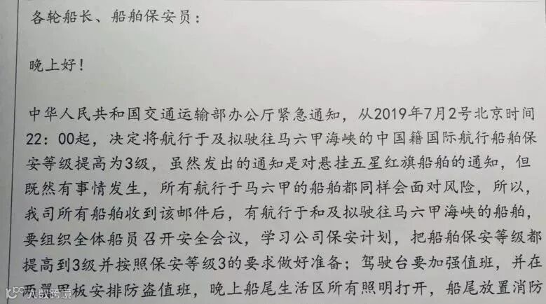 7月3日,多种渠道发现一份交通运输部办公厅发布的《关于将航行于及拟驶往马六甲海峡的中国籍国际航行船舶保安等级提升为3级的通知》。