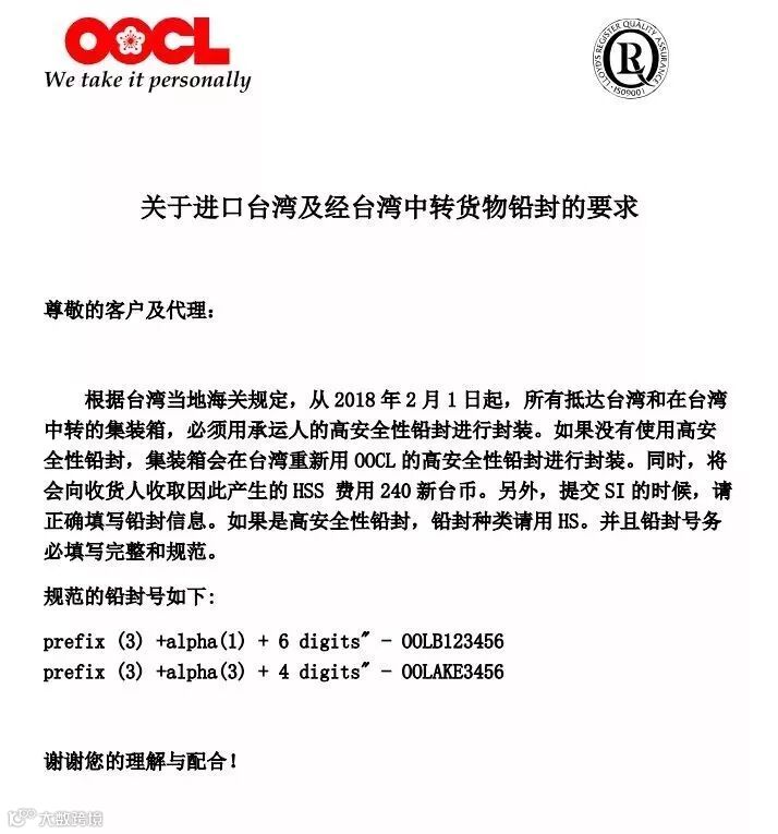 OOCL关于进口台湾及经台湾中转货物铅封的要求