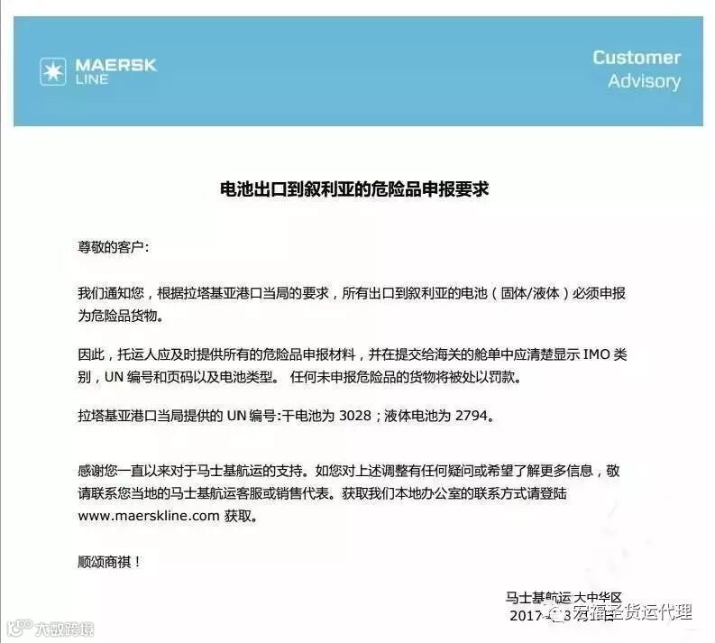 近期接马士基(MAERSK)船公司通知,根据拉塔基亚港口当局的要求,所有出口到叙利亚的电池(固体/液体)必须申报为危险品货物。拉塔基亚港口当局提供的 UN 编号:干电池为 3028;液体电池为 2794具体通知如下: