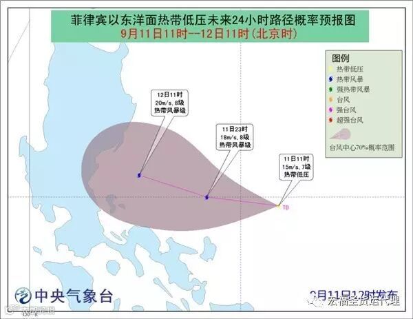 菲律宾以东洋面热带低压于11日上午11点钟生成,其中心位于菲律宾马尼拉以东约530公里的洋面上,就是北纬14.8度、东经125.9度,中心附近最大风力有7级(15米/秒),中心最低气压1005百帕。