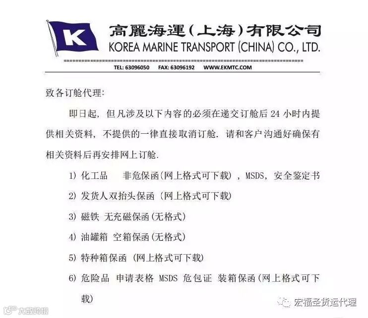 近期接KMTC(高丽海运)通知,即日起, 但凡涉及以下内容的必须在递交订舱后24小时内提供相关资料, 不提供的一律直接取消订舱!
