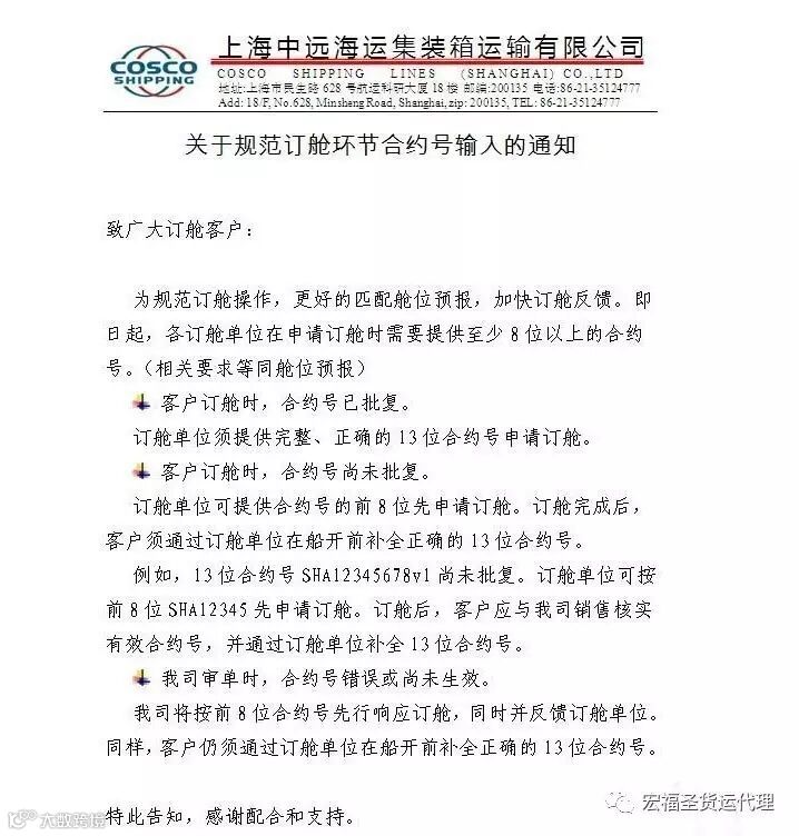 另外,订舱后,客户应与COSCO销售核实有效合约号,并通过订舱单位补全13位合约号。