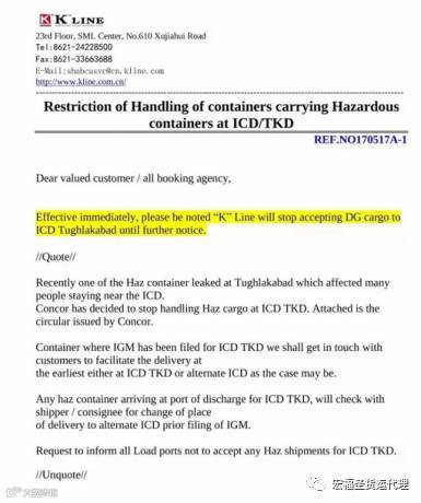 从即日起,KLINE停止接受去往ICD TUGLAKABAD的危险品订舱,直到日后另行通知。
