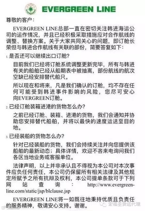 就最近媒体关于韩进海运可能破产的消息,中远集装箱于2016年08月31日宣布暂停与韩进海运的商务合作并公开发布告客户书,表示:“我们将密切关注事态的发展,以确保您的货物安全托运。对于可能装载在韩进海运的货物,我们已经制定紧急预案。就已经装运或即将装运的货物,我们将竭尽所能、谨慎处理,力求将可能产生的运输阻滞减少到最低,以减少该事件对贵司的不利影响。”(来源:中远海运集装箱)