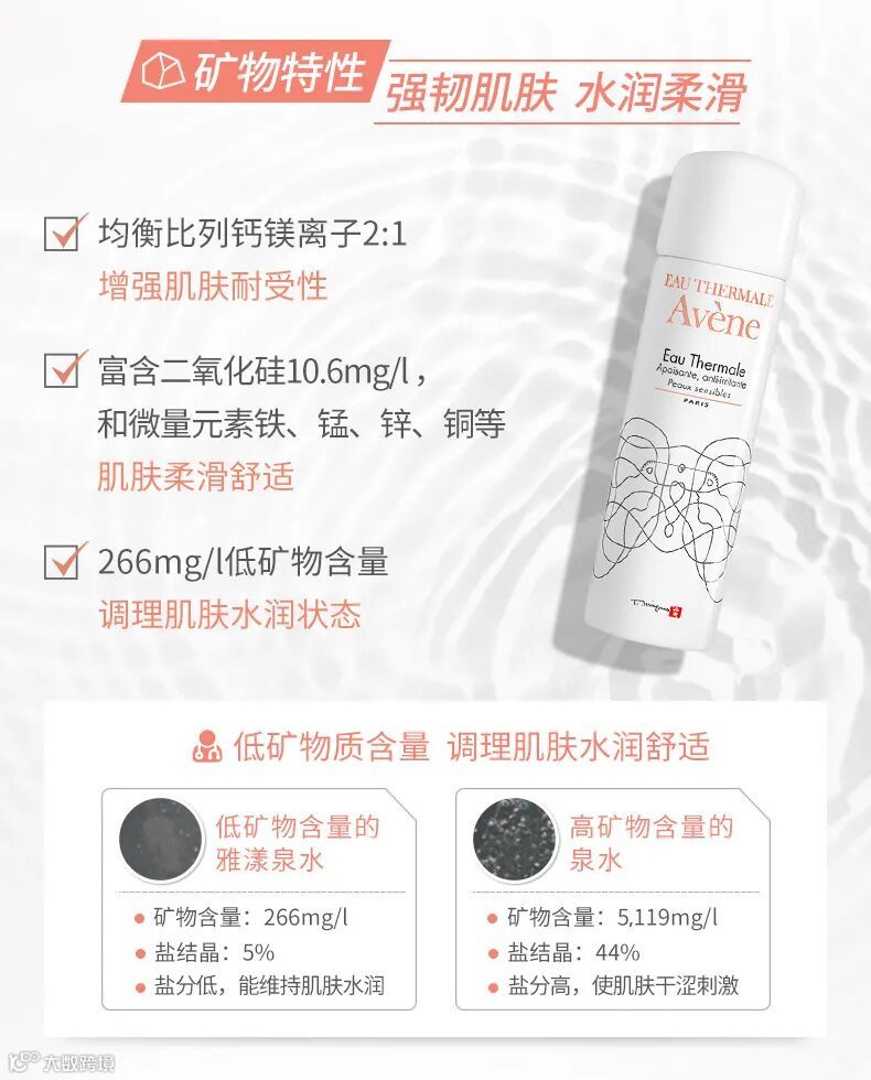 依云矿泉喷雾产于法国阿尔卑斯山,经过最少15年冰川岩层过滤而成,含有多种矿物质,持续使用能增加皮肤弹性,其独特的喷嘴设计每次可喷出百万滴依云天然矿泉水,有助按摩及滋润面部肌肤及有助于妆容贴面持久。