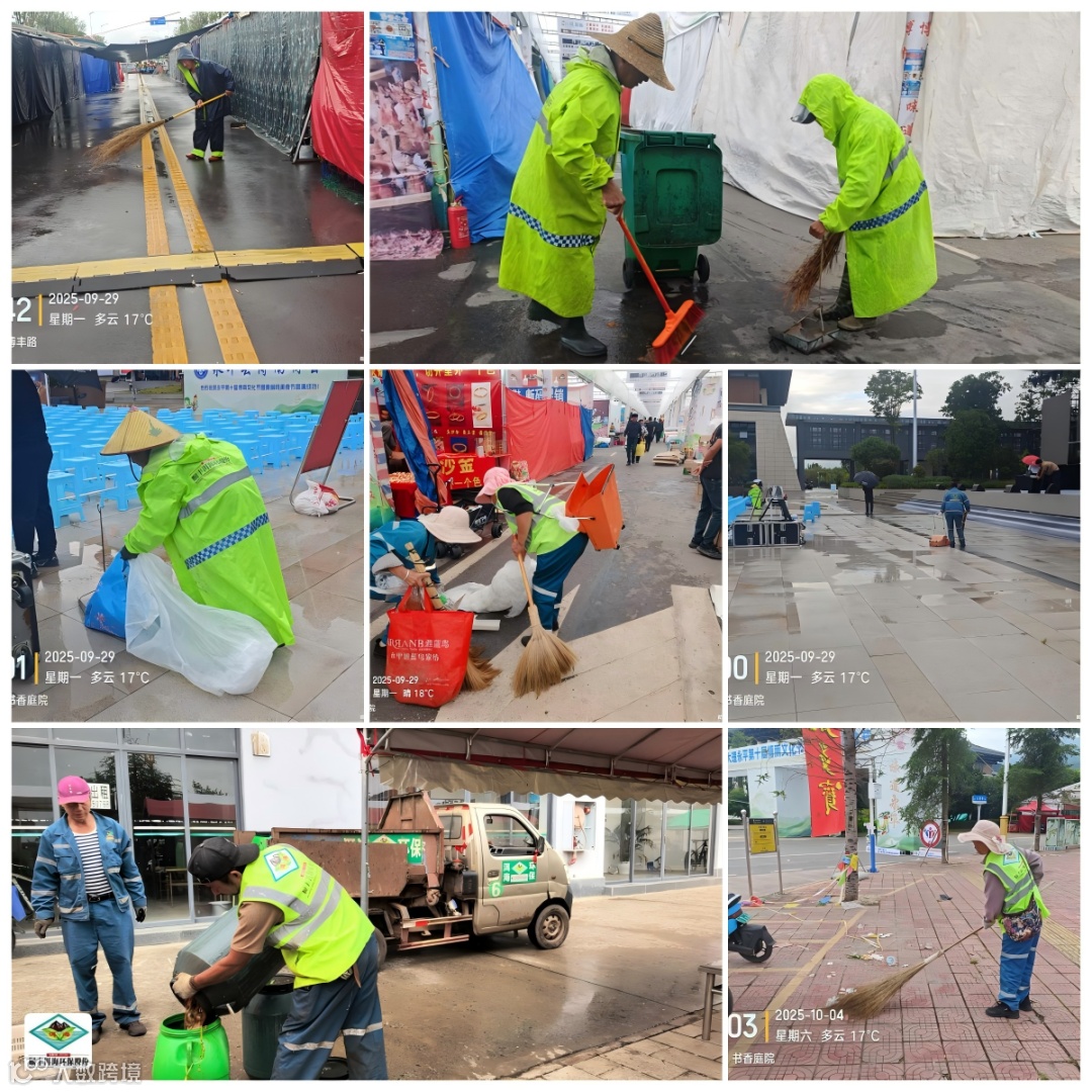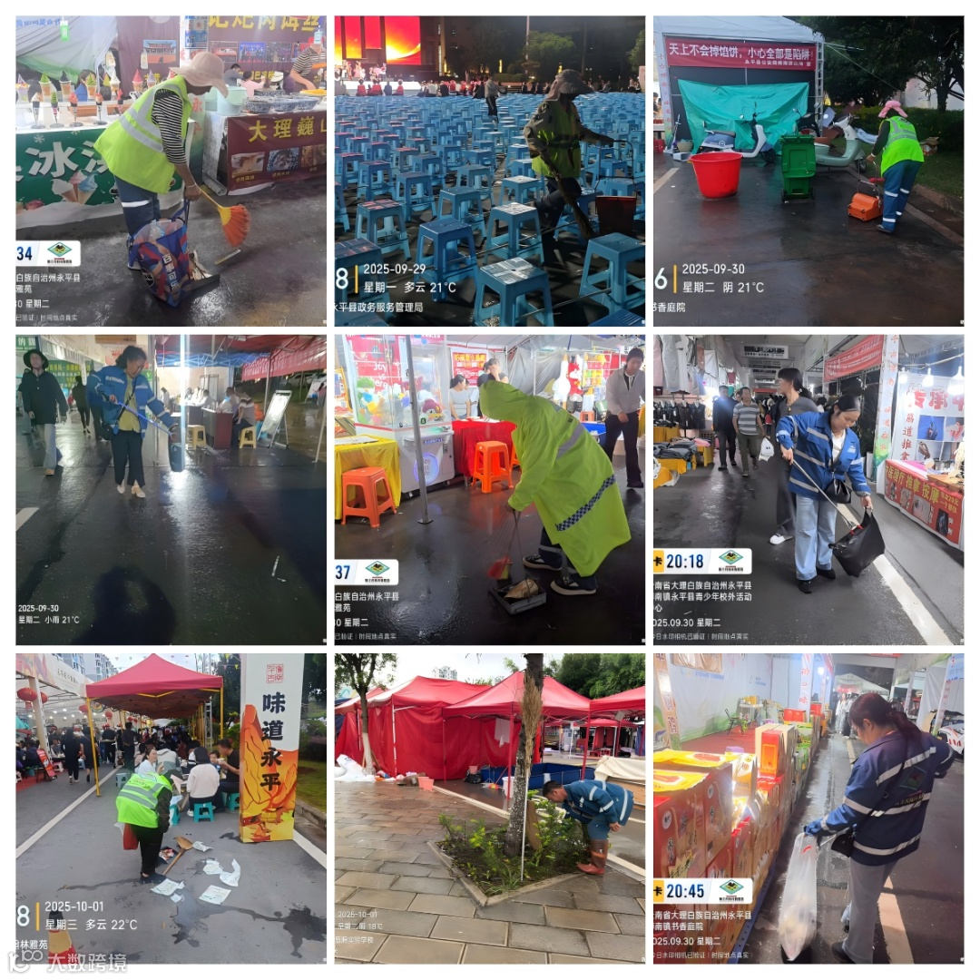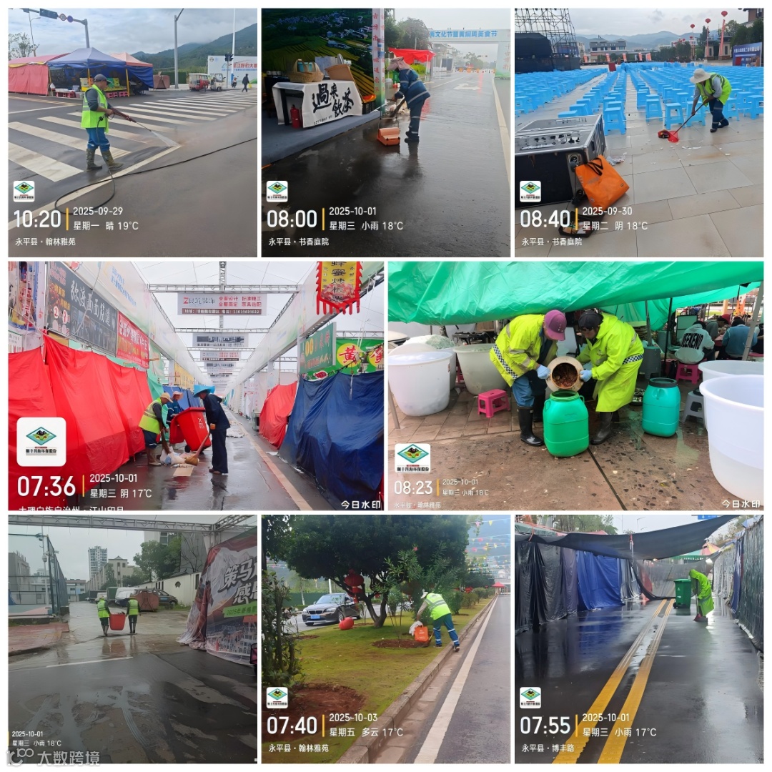 9月29日,第十届博南文化节暨中华黄焖鸡美食节如期而至,为确保活动期间环境卫生干净整洁,永平县顺丰洱海环保科技有限责任公司高度重视,多措并举,合理调配保洁人员、加大道路清扫保洁力度,全方位落实活动期间环境卫生保障工作。