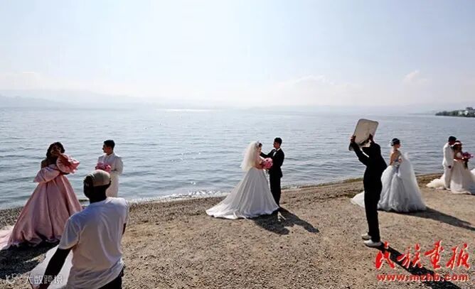 洱海美景吸引许多新人前来拍摄婚纱照。