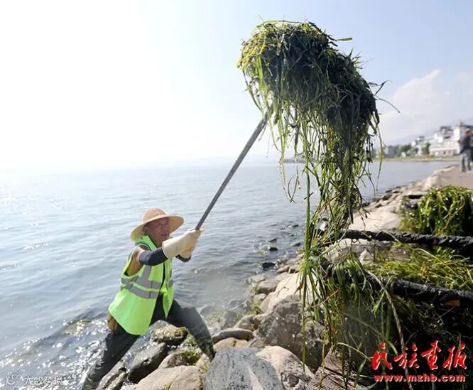 工作人员打捞干枯的水生植物。