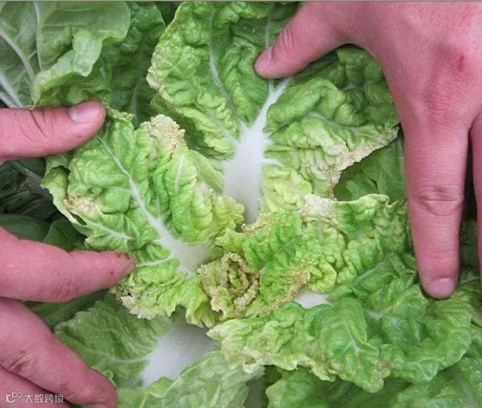 表现部位:首先在新叶、顶芽、果实等生长旺盛而幼嫩的部位表现出症状。危害表现:缺钙时叶片尖端部分弯曲黄白化,叶缘向上或向下皱褶(降落伞形),有时有黏液的分泌。顶端幼叶常变为黑褐色会造成顶芽、侧芽、根尖等分生组织易腐烂、死亡,呈“断脖”症状如甘蓝出现焦叶病、大白菜干烧心等。缺钙时植物的根常常变黑腐烂。